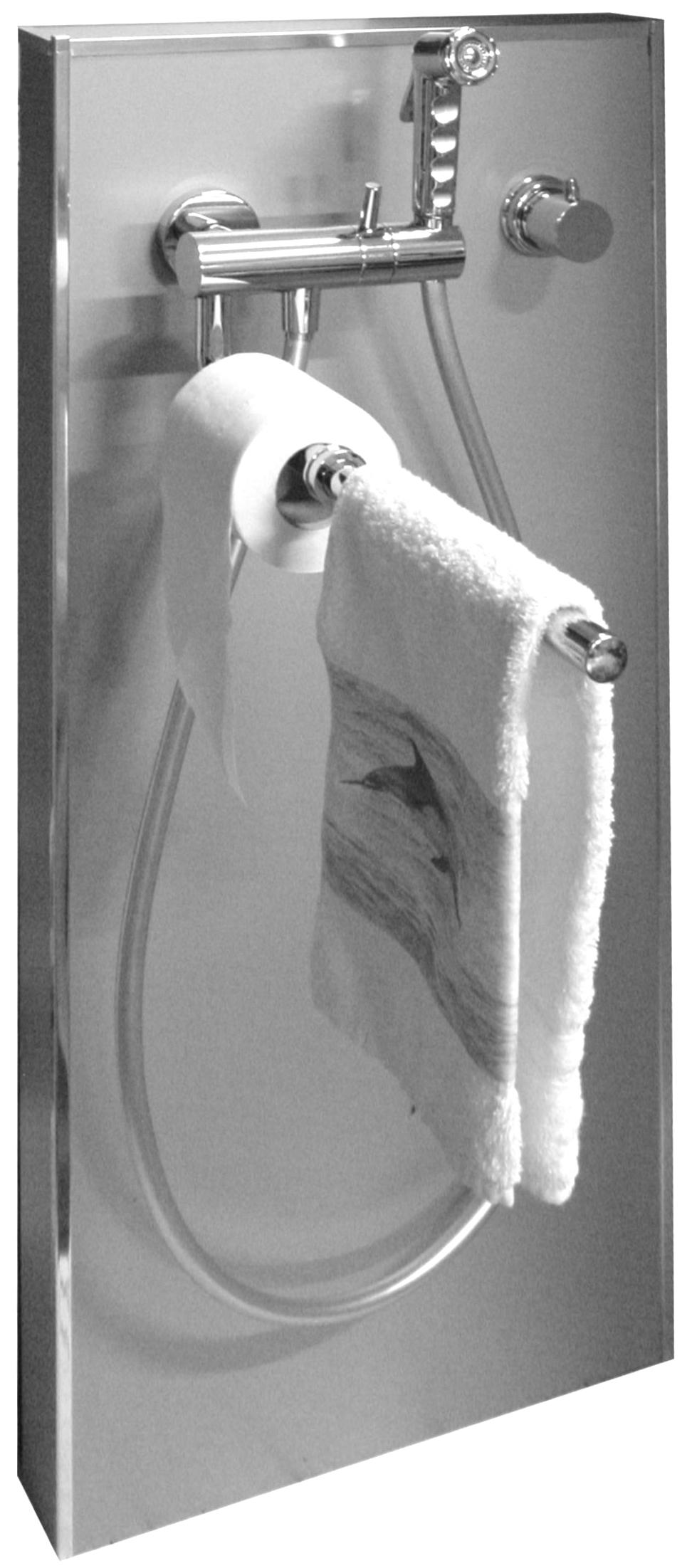 L'ultimo nato è il kit water/bidet, anch'esso unico nel settore, in grado di sostituirsi al bidet tradizionale senza dover demolire nulla, basta semplicemente togliere il vecchio bidet, installare il nostro kit che può essere richiesto nelle dimensioni e nel colore che si preferisce e novità assoluta 2021 anche in legno in 24 colori di cui 6 essenze legno e 18 colori. Il kit water/bidet raggruppa in soli 40 cm di larghezza, 100 cm di altezza e 7 cm di profondità un miscelatore termostatico, una doccetta doppio uso water/bidet, un porta carta igienica girevole, un porta salviette girevole e una mensolina d'appoggio, il tutto installato su un mobiletto in alluminio completamente personalizzabile e/o in legno che contemporaneamente serve anche per coprire l'impianto idrico del vecchio bidet.